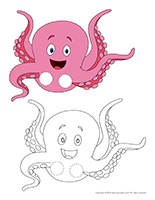 (Open models-Octopuses) Print several copies. Let children decorate their octopus with a variety of arts & crafts materials (pompoms, glitter, confetti, scraps of paper, etc.).