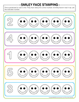 (Open smiley face stamping) Print a worksheet for each child. They must stamp the correct number of smiley faces in each row, per the number indicated.