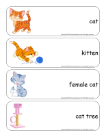 The flashcards may be used during circle time to spark a conversation with the group or in your reading and writing area. They may also be used to identify your thematic bins. (Open word flashcards-Cats and kittens) (Open giant word flashcards-Cats and kittens) cat, kitten, female cat, cat tree, claws, paws, cat hair, cat food, bowl, collar, brush, veterinarian