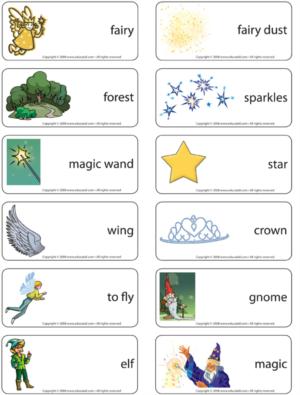 (Open story and memory game - Fairies) Print, cut out, and laminate the pictures. Place the cards face down on the floor. Children pick three cards and invent a story in relation to the illustrations. Variation: Print the pictures twice and use as a memory game.