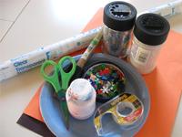 1. Gather your materials. You will need a paper plate, some orange and black construction paper, 2 buttons, some sequins, sparkles, contact paper, scissors, double stick tape, a stapler, and some ribbon. I also used some paint because my son wanted to paint and I like how it looks but you can skip this step if you want.