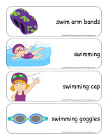 (Open word flashcards-At the pool) (Open giant word flashcards-At the pool) Print and laminate the word flashcards. Have each child pick a word and present it to the group (ex. swimming goggles). Ask them questions to see what they know about the theme.
