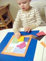 6. Have children add glue and start placing pieces. At first I was directing the activity and things were fine, but then I heard "I do it!" so I conceded. If I am going to preach allowing children to do it themselves, I best practice that too.