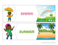 (Open weather wheel) Print, laminate, and display. Select a different child to play the role of the weather forecaster each day. Discuss the day's weather and determine, as a group, where the arrows on the wheel should point. Invite your weather forecaster to place the arrows accordingly. On a day with a mixture of sun and rain, use the two arrows. Otherwise, have both arrows point to the same pictogram. Collect objects which correspond to the different seasons and ask children to name the seasons they belong to. Ask questions about the characteristics of each season: temperature, sports and activities we can enjoy, nature, means of transportation...