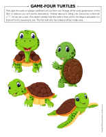 (Open game-Four turtles) Print, glue the cards on opaque cardboard and cut them out. Arrange all the cards upside down on the floor or table (so you can’t see the illustrations). Children take turns rolling a die. Every time a child rolls a “1”, he can turn a card. If he doesn’t already have this turtle in front of him, he keeps it and places it in front of him for everyone to see. The first child who has collected all four turtles wins.