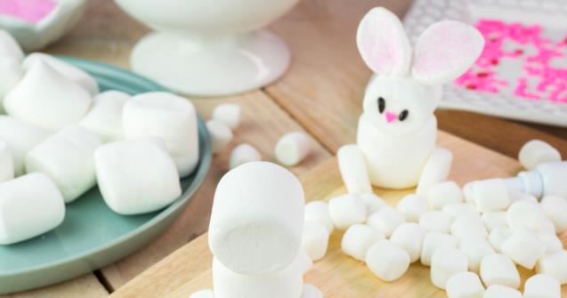 8. Glue the bunny head on the glass jar so that you can see the marshmallows at the bottom of the jar. Use the ribbon to add a bow tie and you'll have the perfect Easter centrepiece!